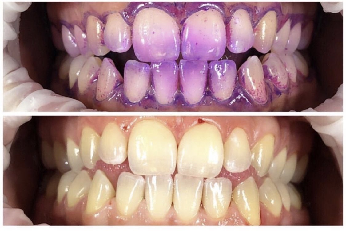 Een gebitsreiniging...dat is toch met die nare haakjes en korrelige polijstpasta op een borsteltje? Nee. Er is een nieuwe manier van het intensief reinigen van je gebit, het verwijderen van het aanwezige tandsteen en (rook)aanslag. Maar dan wel op een comfortabele en pijnloze manier. Je zult versteld staan van het ultraschone resultaat. Zoals hieronder op de afbeelding te zien is: